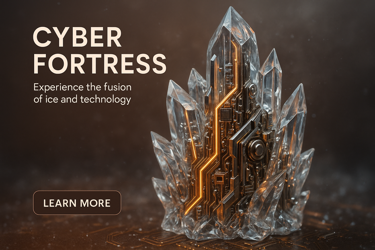 /Collection: /by davooda/Type: PNG/A stunning 3D depiction of a crystal fortress, intricately designed with glass-like polymers and glowing components. The scene captures the fusion of technology and ice in a dramatic, blurred background.