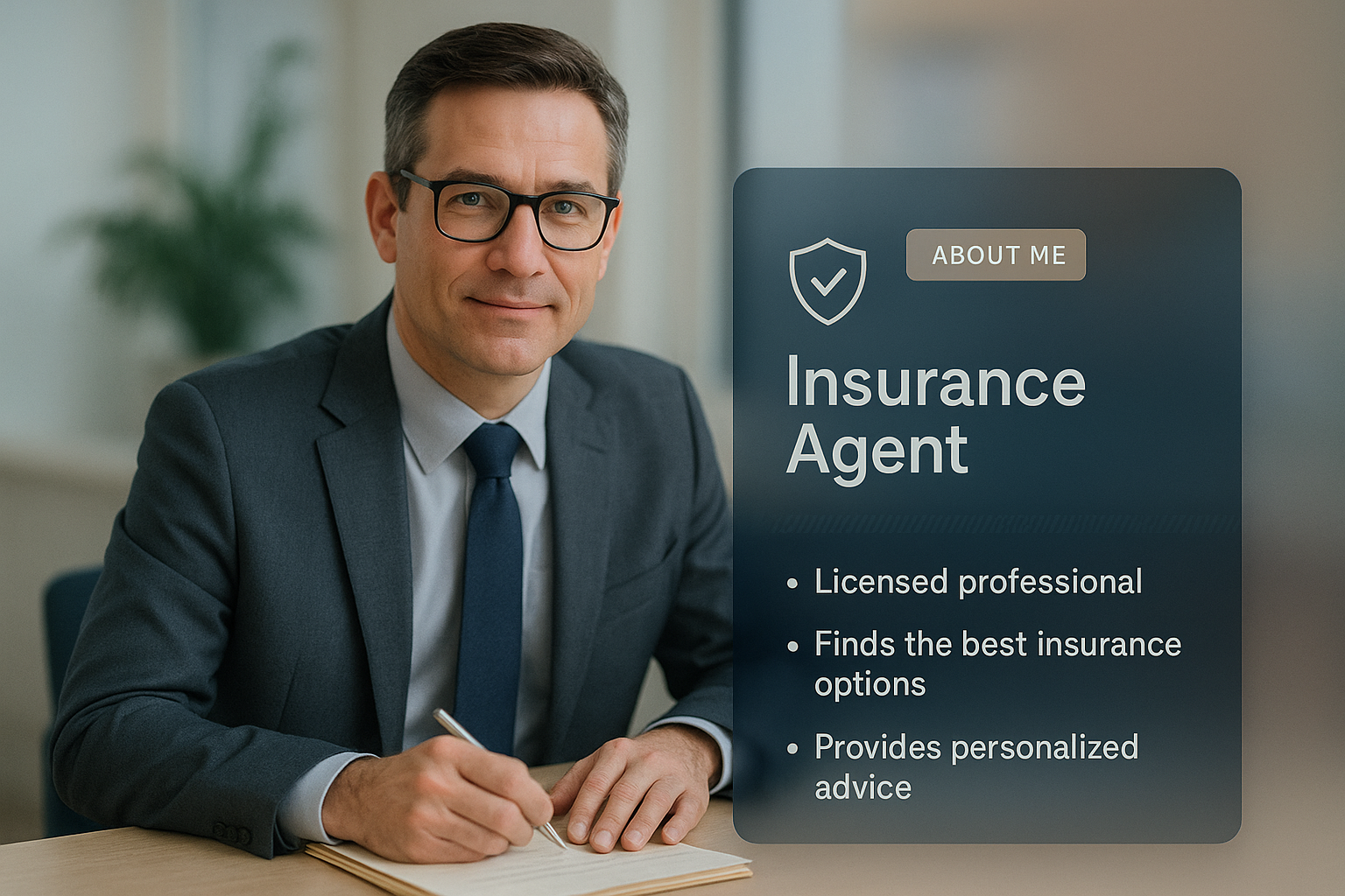 /Collection: /by davooda/Type: PNG/A professional insurance agent is seated at a desk, writing notes. The image features a transparent glass panel containing key information about the agent, highlighted with a modern design.