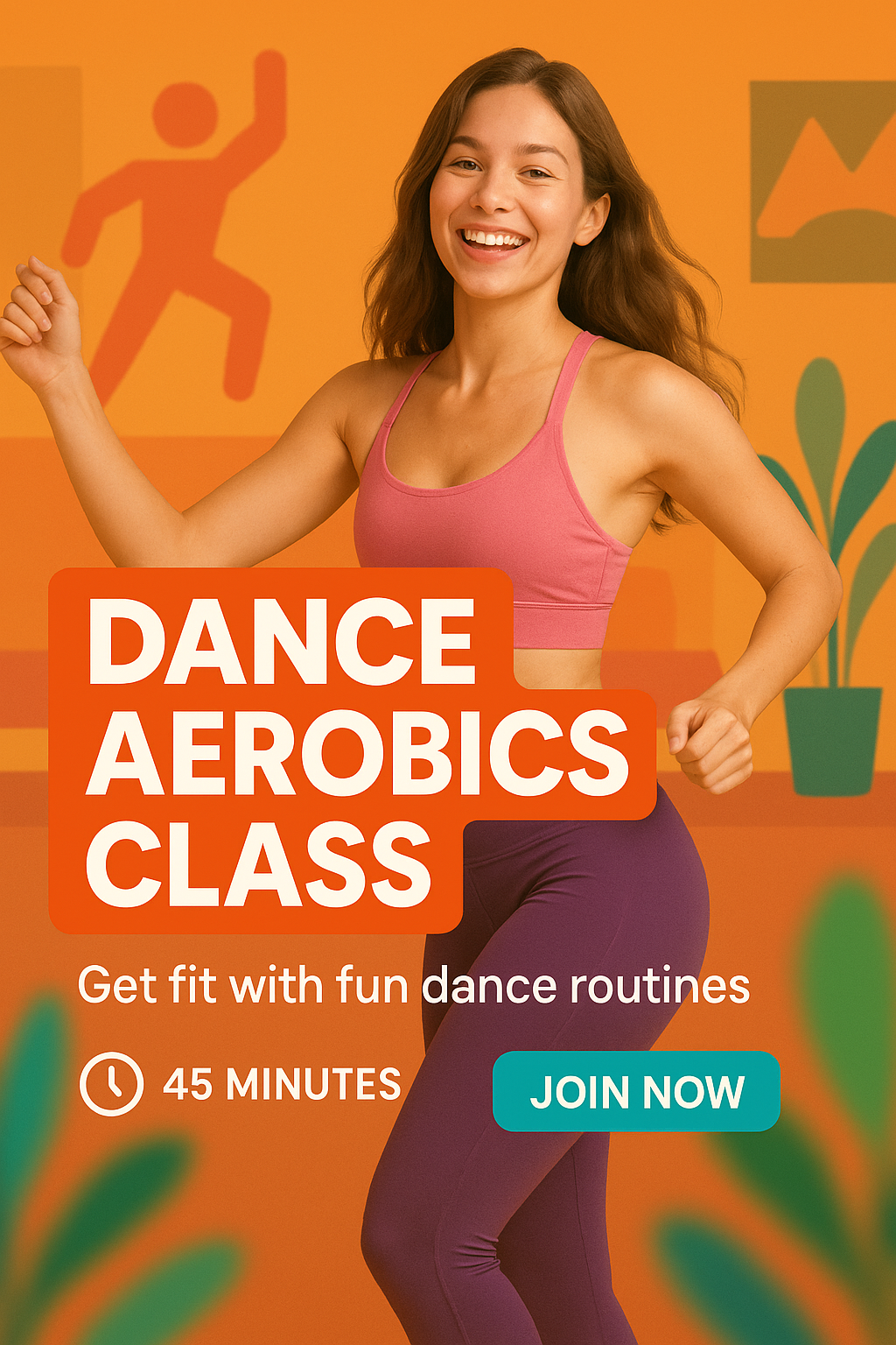 Lively promotional image showcasing a dance aerobics class. Features an energetic participant, bright colors, and a welcoming design, ideal for fitness marketing.