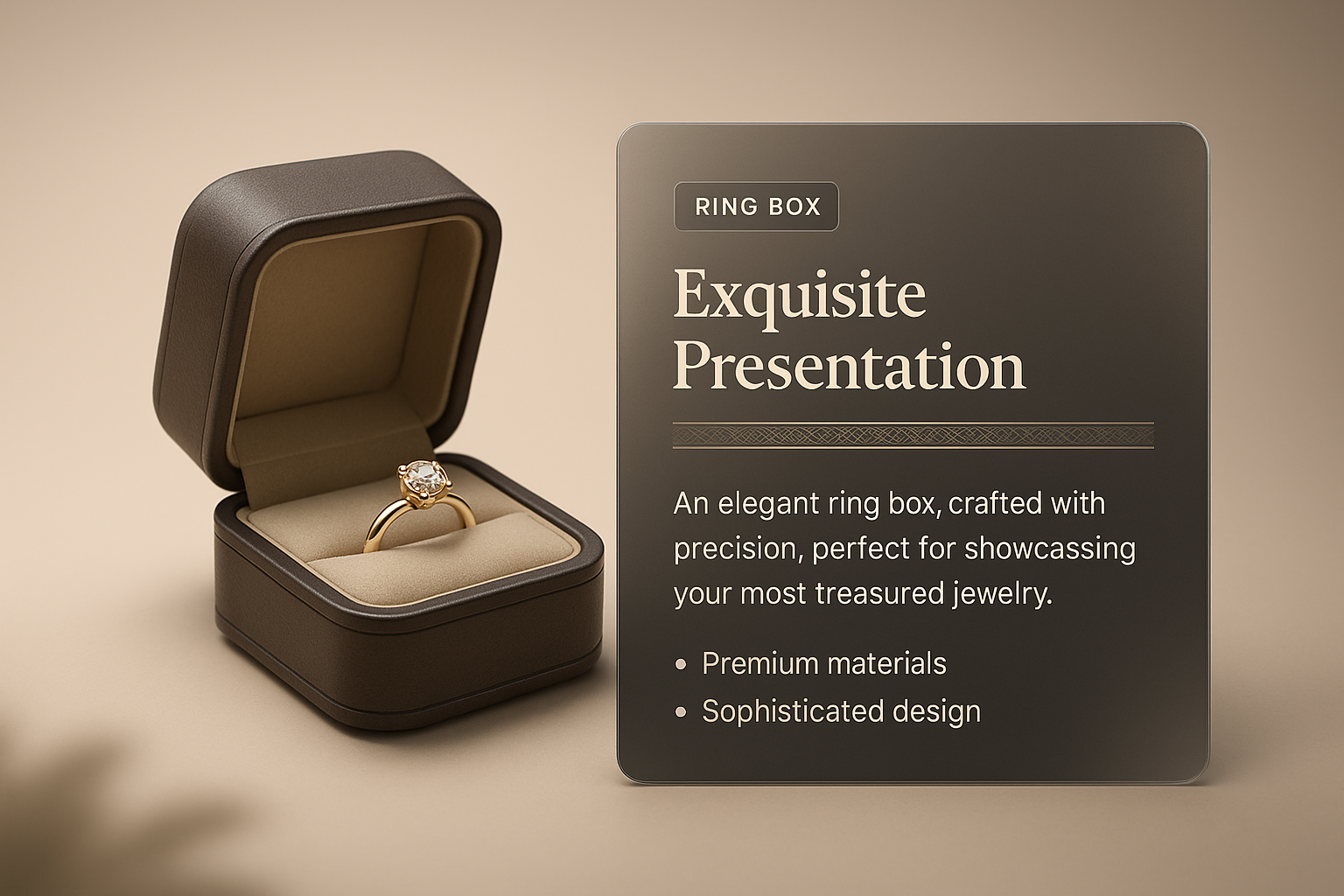 /Collection: /by davooda/Type: PNG/A beautifully crafted ring box showcasing a luxurious ring. The design features a subtle gradient background and an informative panel highlighting premium materials and sophisticated design.