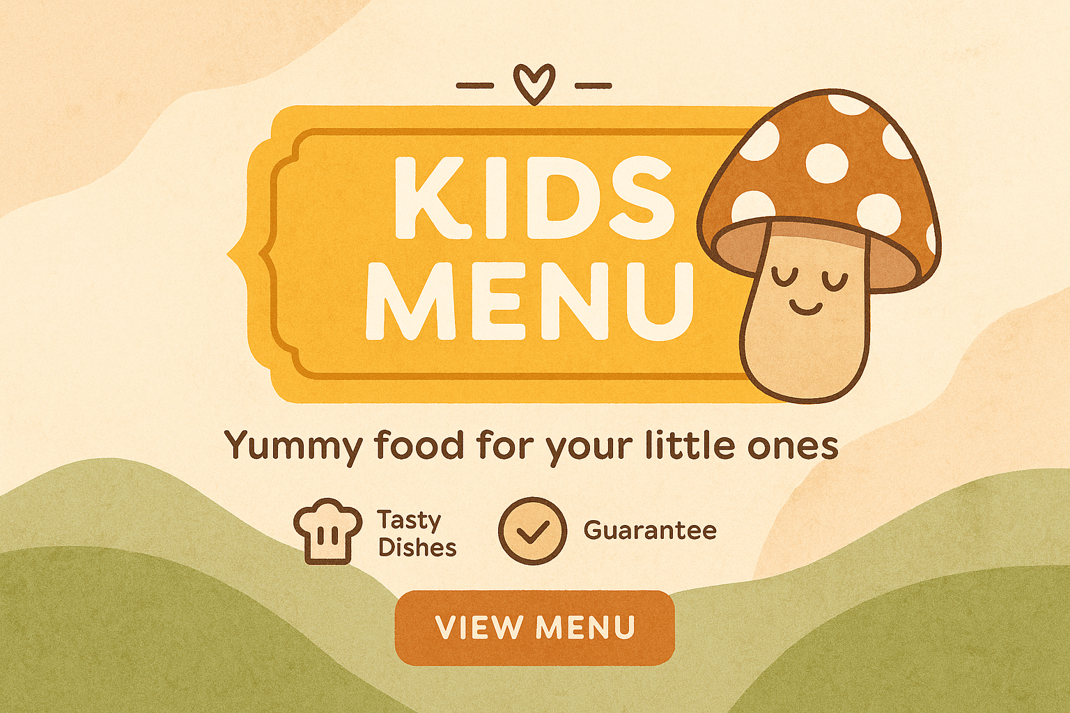 /Collection: /by davooda/Type: PNG/A visually appealing kids menu in a boho style featuring a cheerful mushroom character, engaging typography, and a soft color palette. The design includes icons for tasty dishes and a guarantee, inviting viewers to explore the menu.