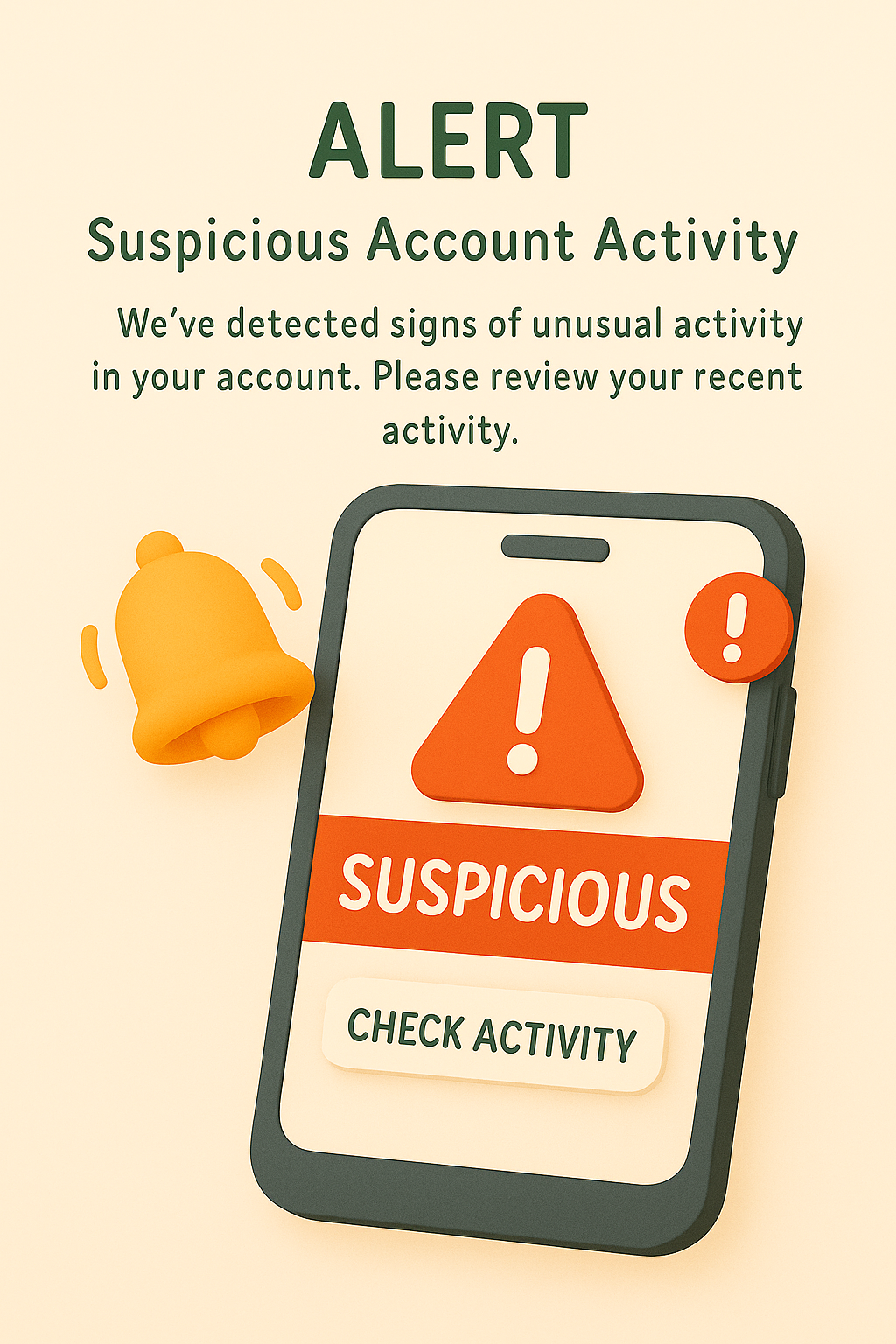 A 3D graphic of a smartphone displaying an alert notification about suspicious account activity. Ideal for cybersecurity awareness and user notifications.