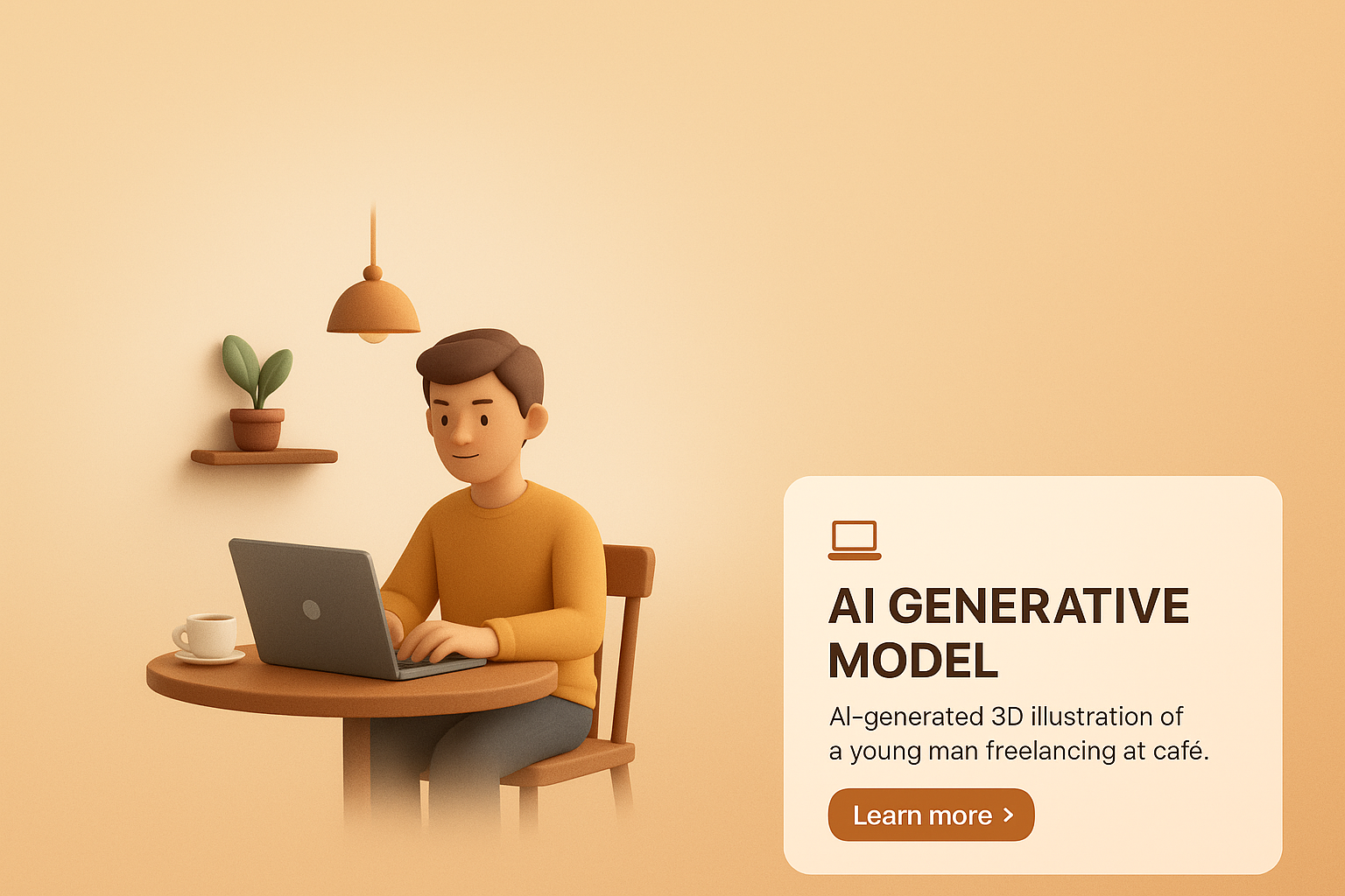A young man is focused on his laptop in a warm cafe setting. The scene captures a blend of realism and simplicity, showcasing the freelancer's environment from a slight distance.