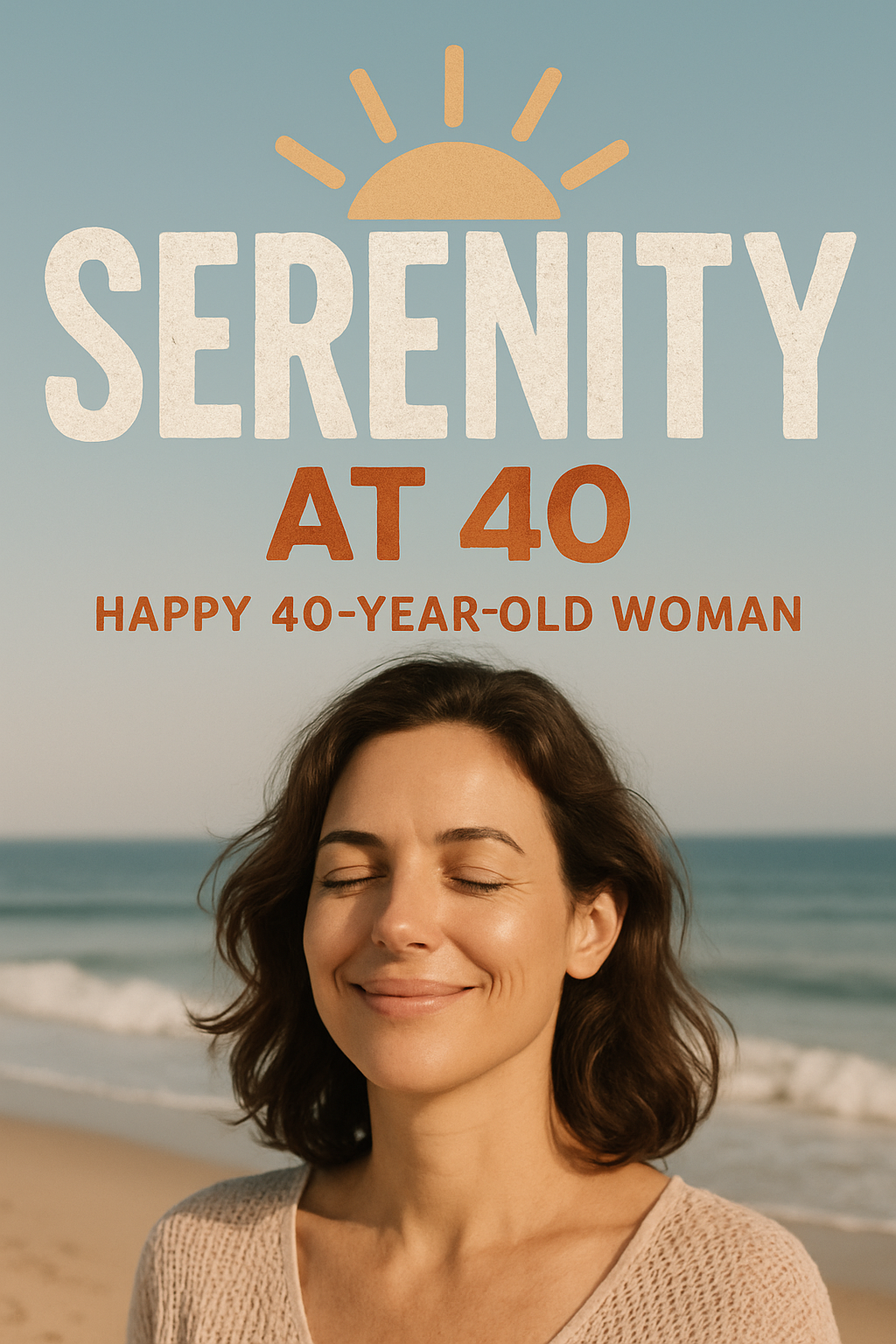 A serene beach portrait of a joyful woman celebrating her 40th birthday, encapsulating themes of tranquility and self-acceptance, ideal for birthday celebrations or lifestyle content.