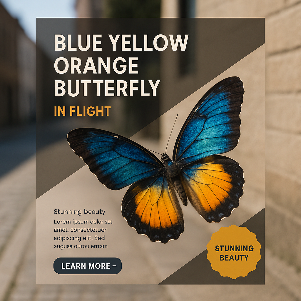 /Collection: /by davooda/Type: PNG/A stunning blue, yellow, and orange butterfly captured mid-flight against a blurred urban background. The composition features stylish text elements and a balanced design.
