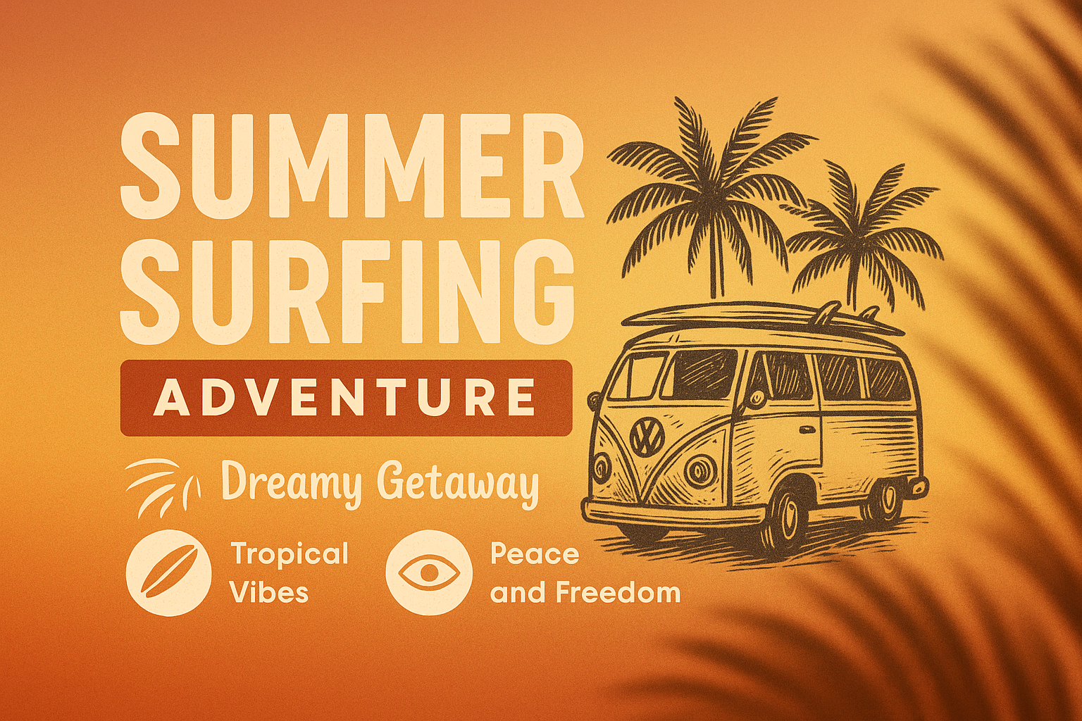 A vibrant summer surfing themed design featuring palm trees, a classic VW van, and inviting text. The warm gradient background enhances the tropical vibes.
