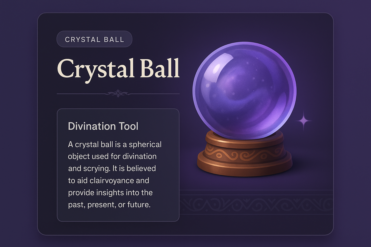 /Collection: /by davooda/Type: PNG/A beautifully designed crystal ball sits atop an ornate base, surrounded by a dark gradient background. The ball features a mystical purple hue, enhancing its allure as a divination tool.
