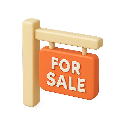 A stylized 3D icon representing a 'For Sale' sign, featuring a vibrant orange color with white typography. Ideal for real estate marketing or sales promotions.