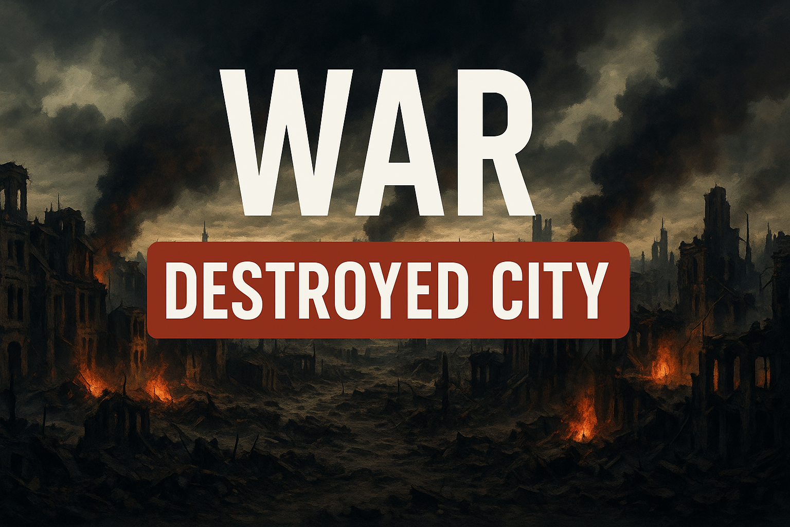 A striking digital artwork illustrating a devastated city after war, featuring dark skies and burning ruins. Ideal for discussions on conflict and its aftermath.