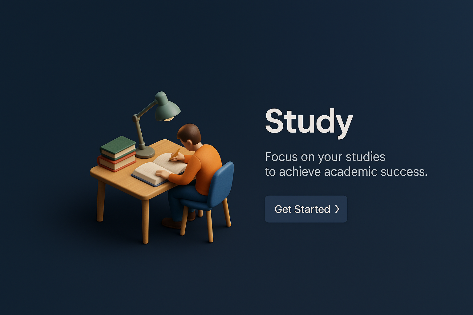 A realistic 3D scene depicting a person studying at a desk, surrounded by books, with a dark gradient background. The scene emphasizes focus and academic success.