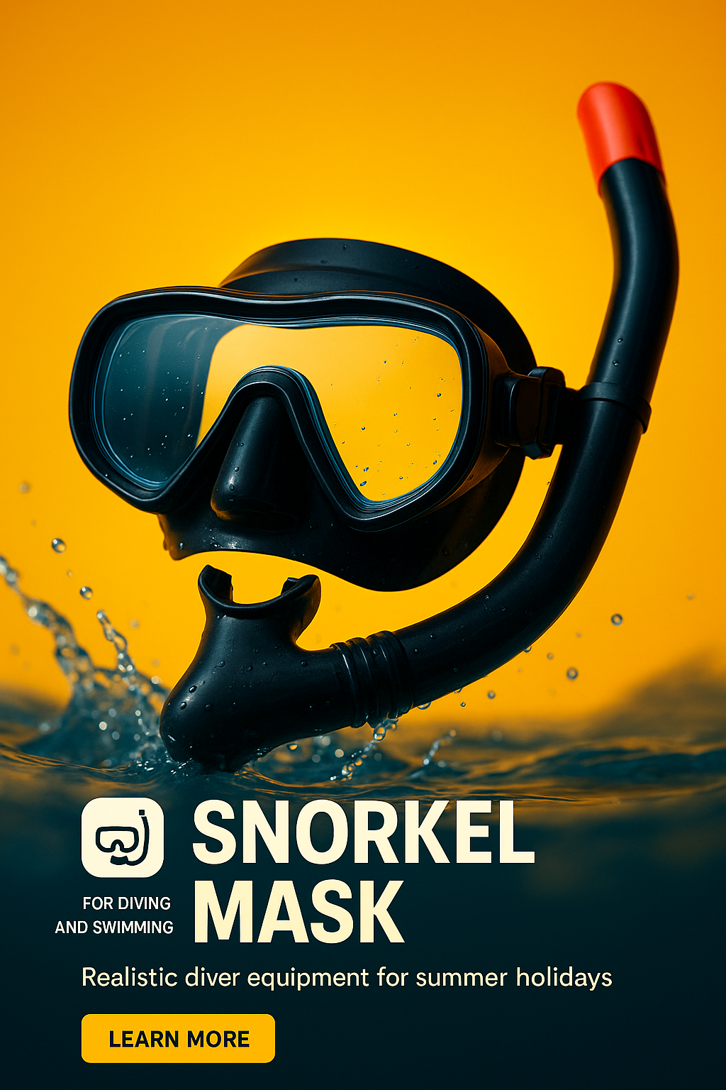This vibrant image showcases a snorkel mask against a bright background, ideal for promoting diving and swimming gear. It's designed for summer holiday enthusiasts.