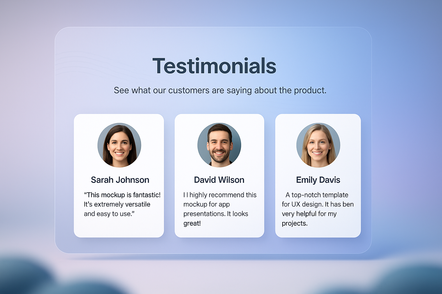 /Collection: /by davooda/Type: PNG/A visually appealing testimonials section featuring three testimonial cards with circular photos, names, and feedback text, set against a smooth gradient background.