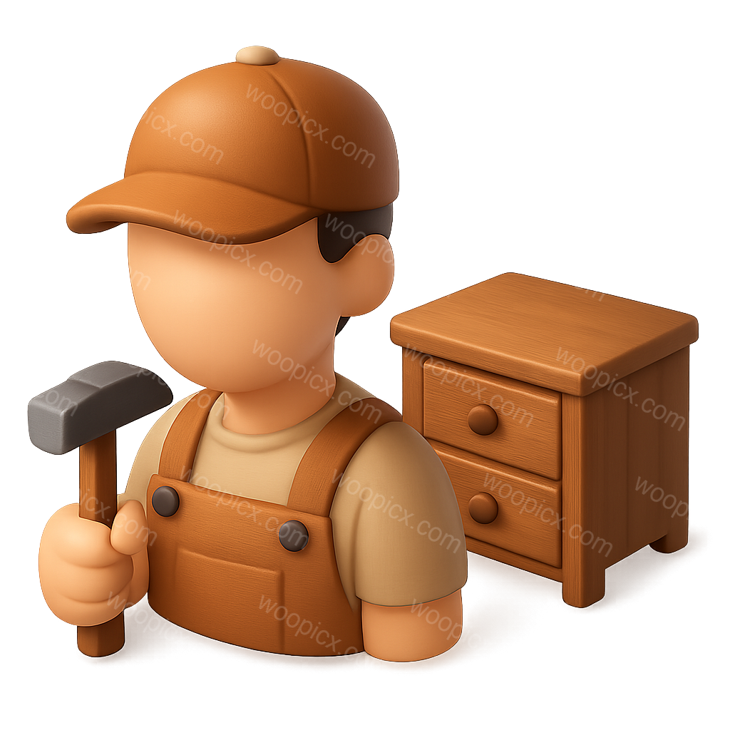 /Premium/Collection: /by davooda/Type: PNG/A stylized 3D icon of a cabinet maker holding a hammer, depicted in a three-quarter view. The character features a cap and overalls, with a wooden cabinet beside them, all against a soft gradient background.