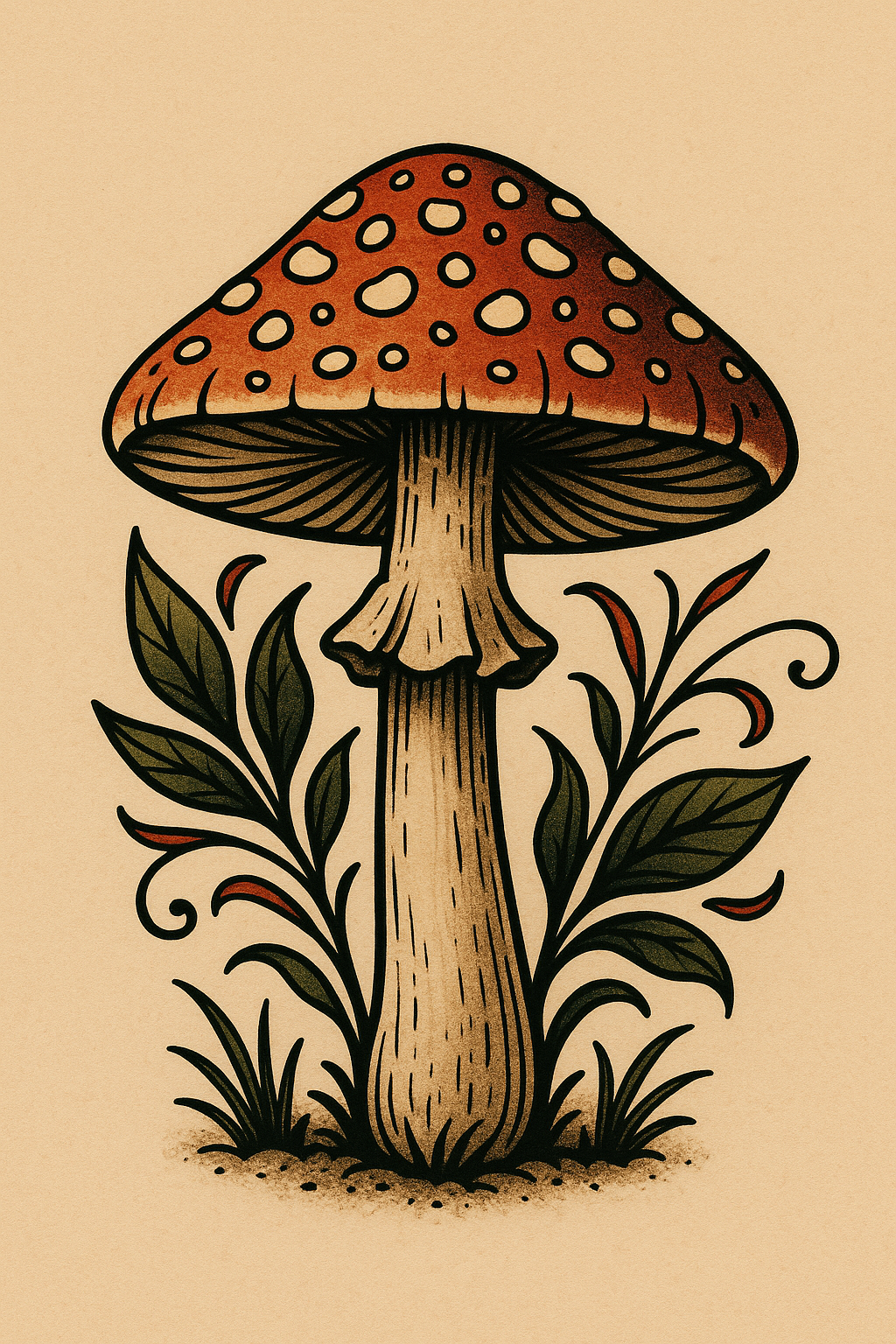 A detailed illustration of a mushroom surrounded by stylized botanical elements. This graphic features a vintage aesthetic suitable for art prints or nature-themed designs.
