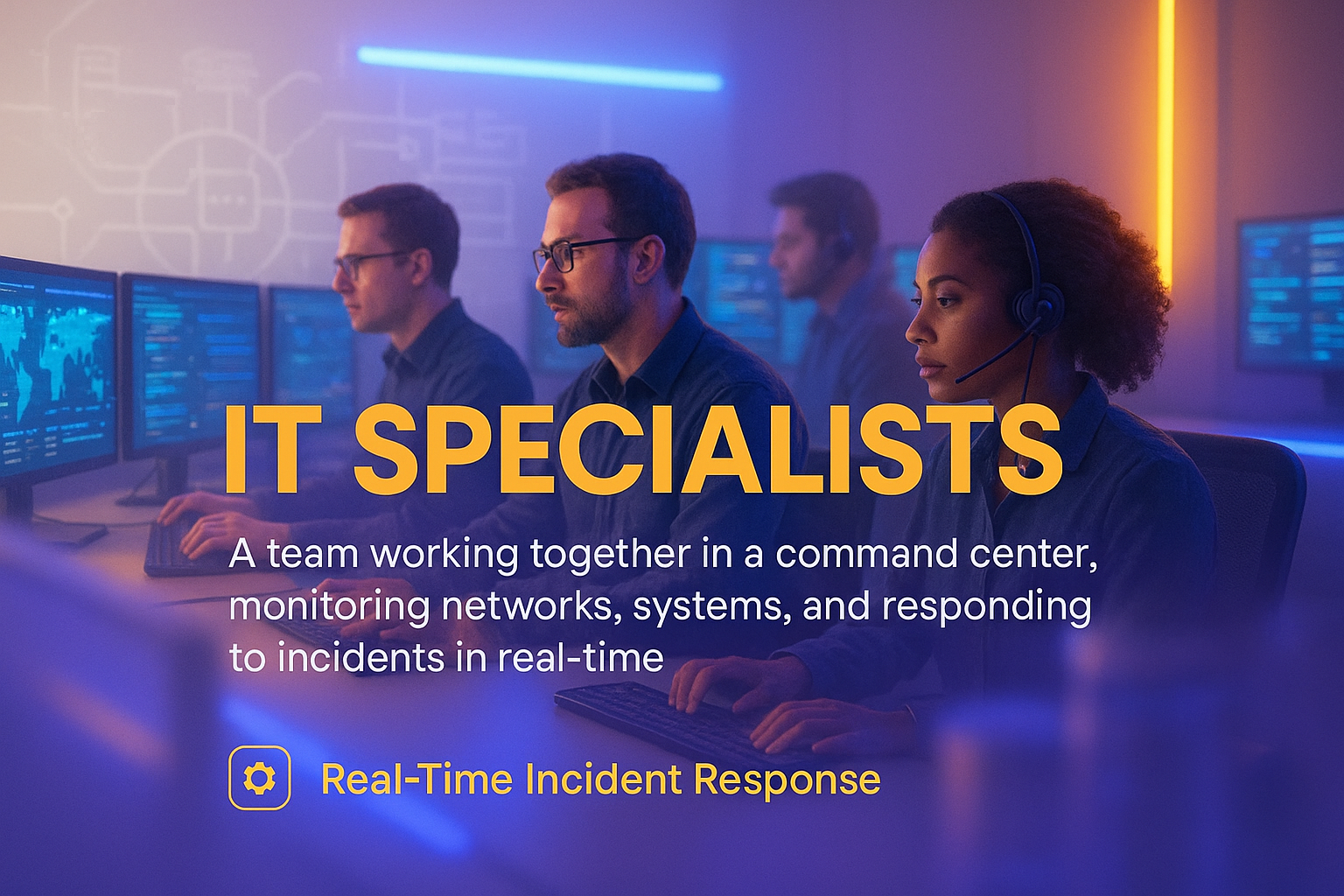 /Collection: /by davooda/Type: PNG/A dynamic image showcasing a team of IT specialists working collaboratively in a command center, focused on real-time incident response. The modern design emphasizes teamwork and technology.