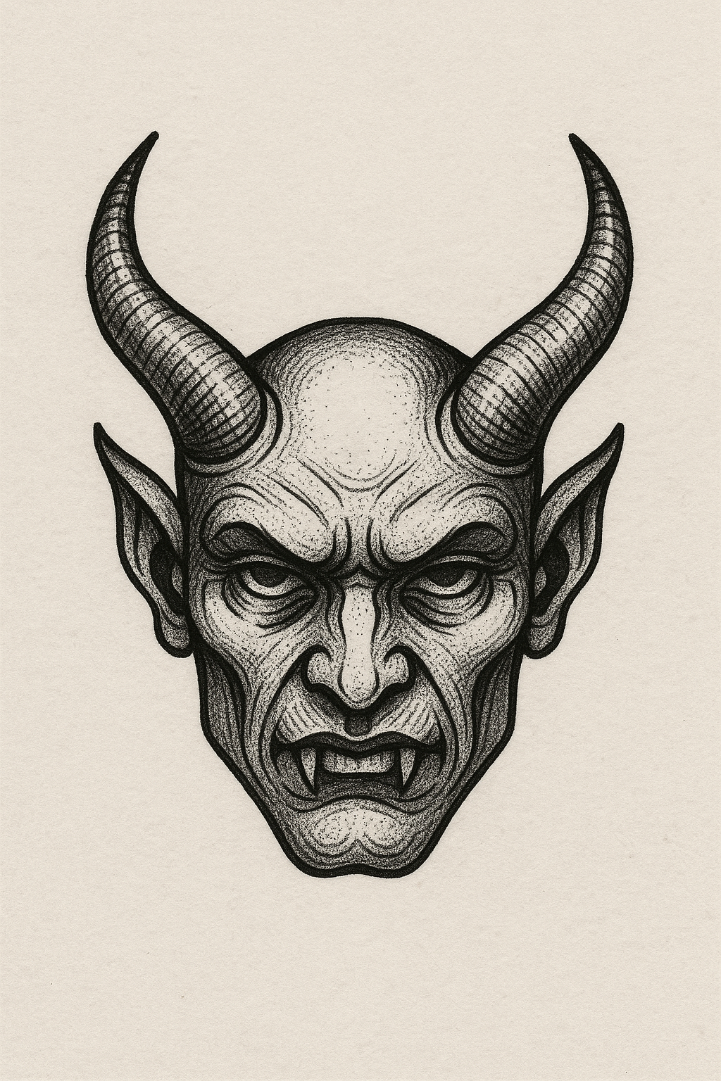 /Collection: /by davooda/Type: PNG/This image features a detailed black and white illustration of a demonic face with prominent horns and fierce expression, ideal for horror-themed art or graphic design.