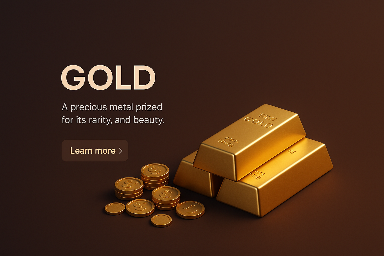 A detailed 3D depiction featuring gold bars and coins on a dark gradient background, emphasizing luxury and richness. The scene is designed to showcase the beauty and rarity of gold.