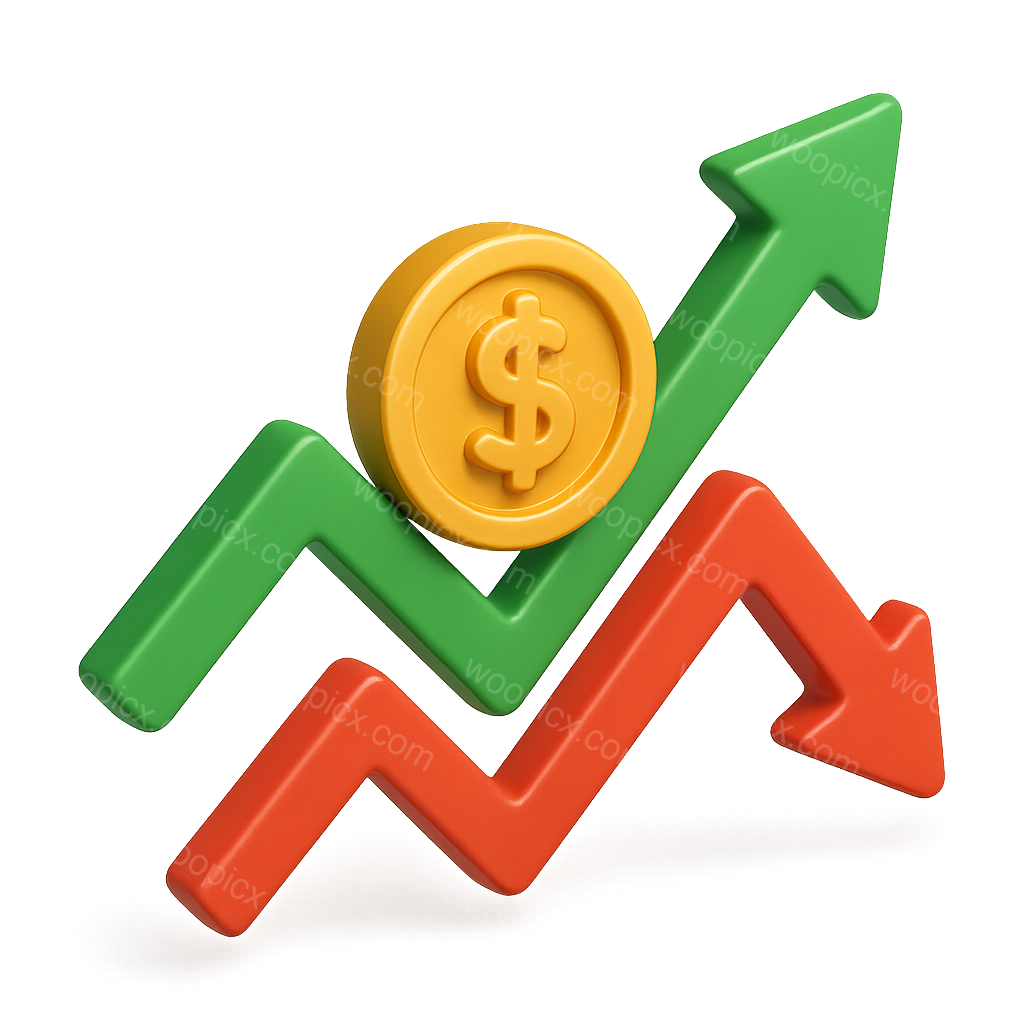 /Premium/Collection: /by davooda/Type: PNG/A visually striking 3D icon featuring upward and downward trend arrows in green and red, with a golden dollar coin at the center, all designed with a transparent background.