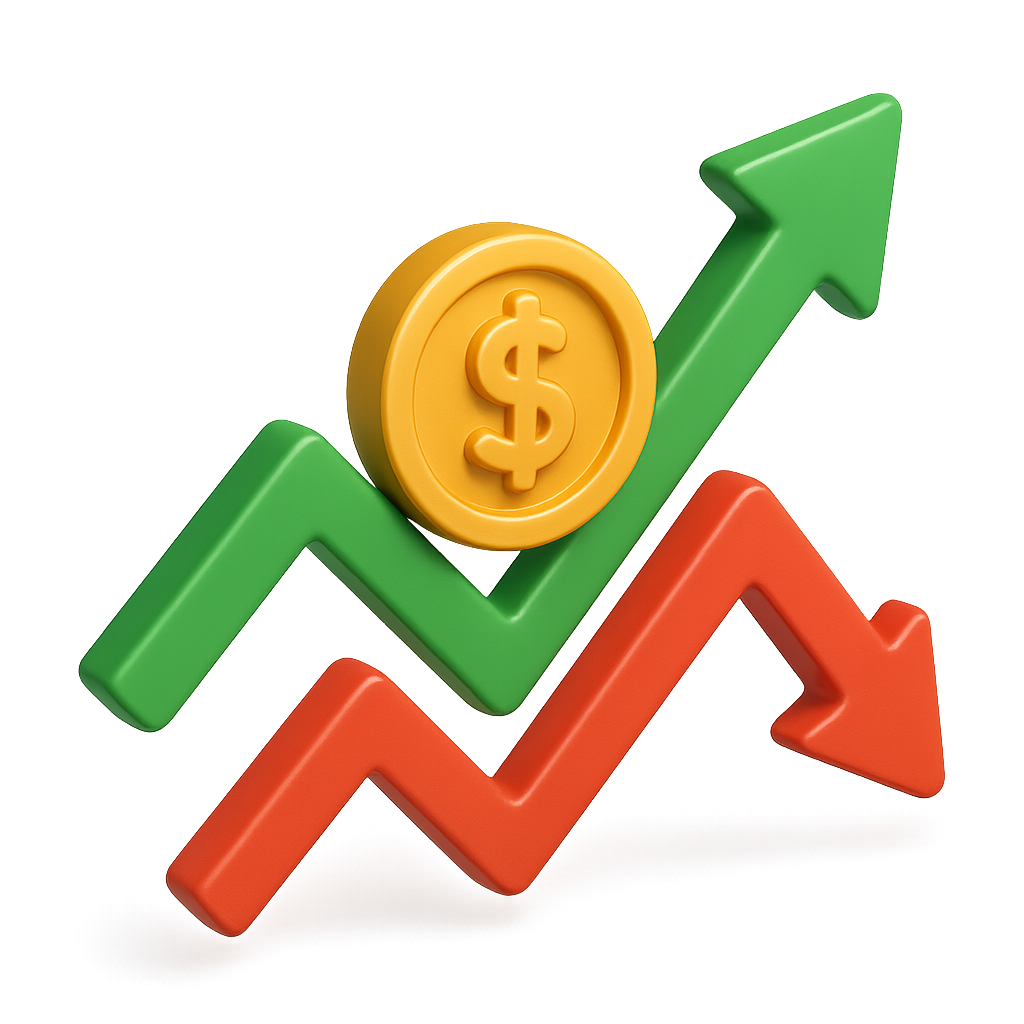 /Collection: /by davooda/Type: PNG/A visually striking 3D icon featuring upward and downward trend arrows in green and red, with a golden dollar coin at the center, all designed with a transparent background.