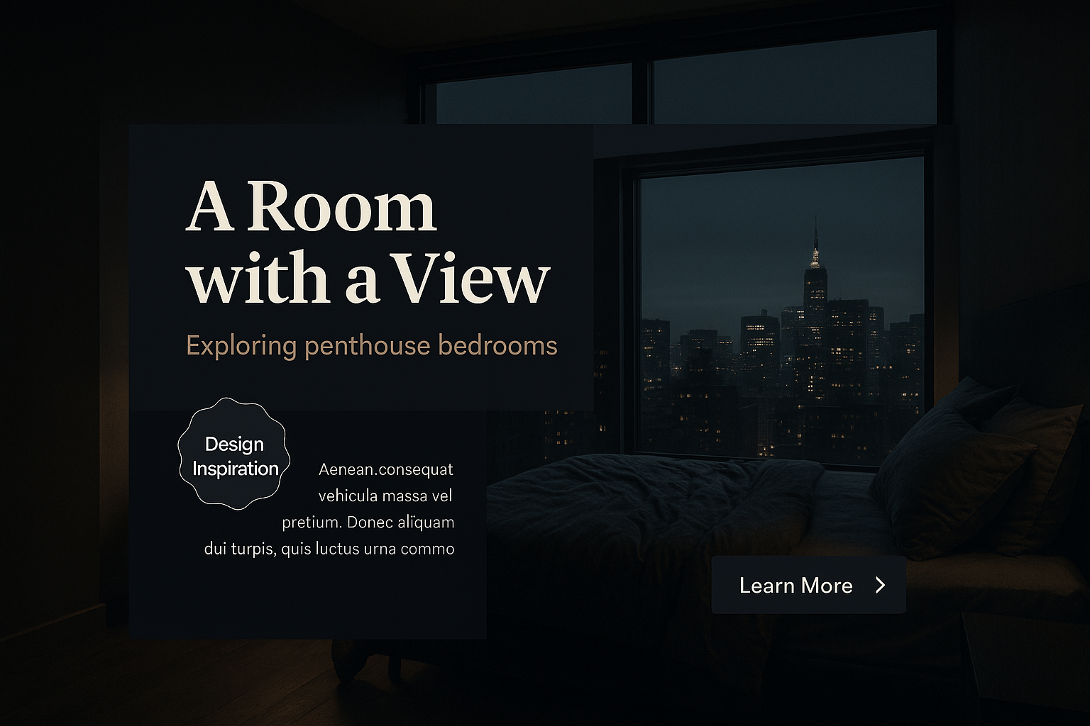 A stylish penthouse bedroom featuring a dark, moody atmosphere with a stunning view of the city skyline at night. The composition includes layered design elements and professional aesthetics.