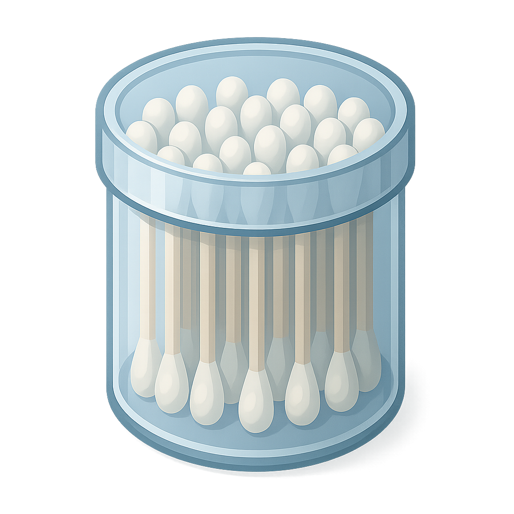 A three-dimensional representation of a transparent container filled with cotton swabs, showcasing a volumetric and isometric design. The swabs are arranged neatly, emphasizing their white tips and wooden sticks.