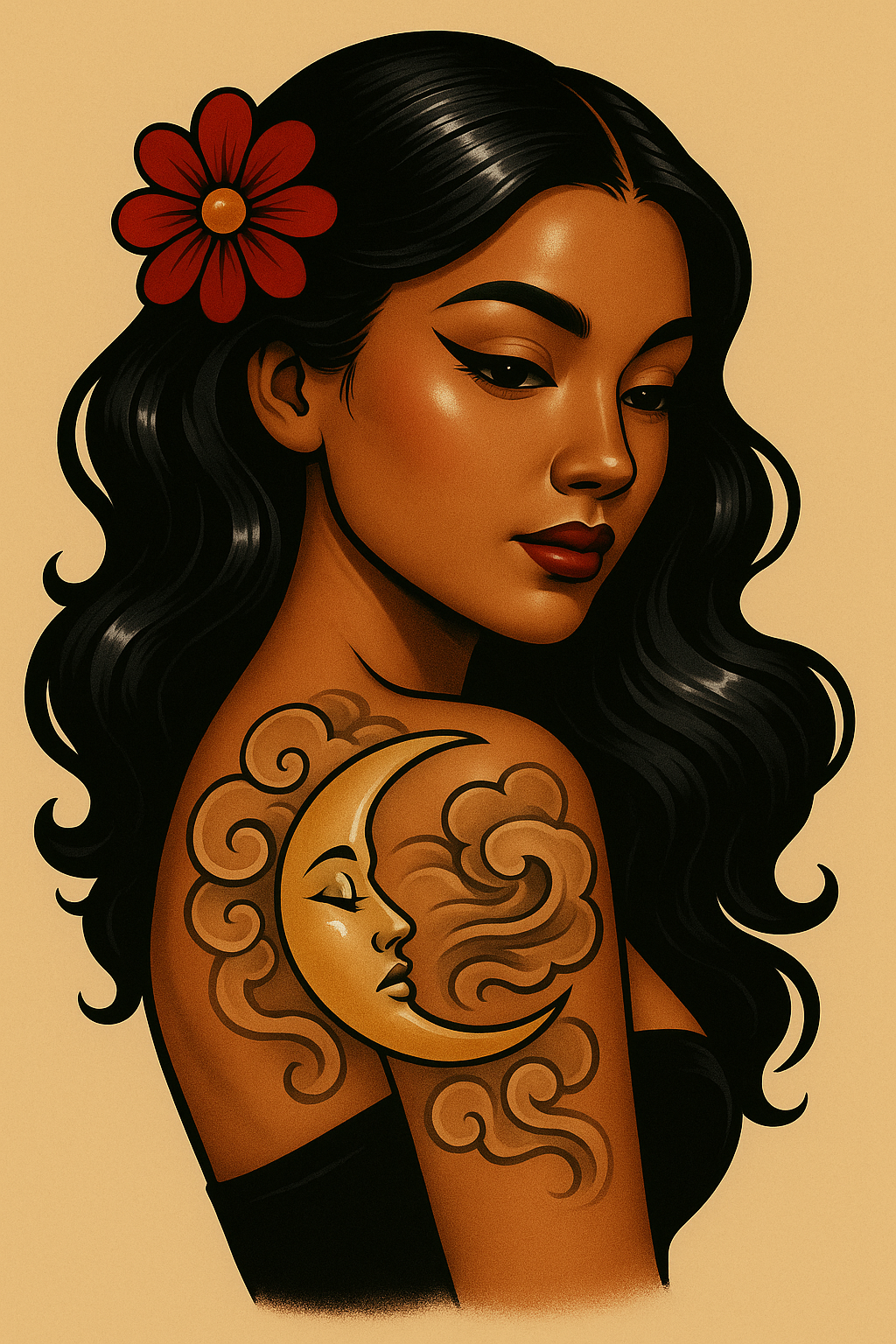 This image features a glossy portrait of a girl with long black hair adorned with a red flower. She has a tattoo of a golden moon and swirling clouds on her arm, set against a soft beige background.