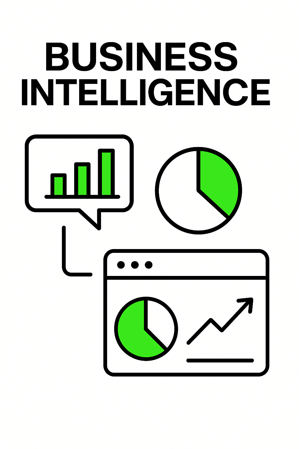 A vector-style illustration showcasing business intelligence concepts with charts and data visualization elements, suitable for presentations and reports.