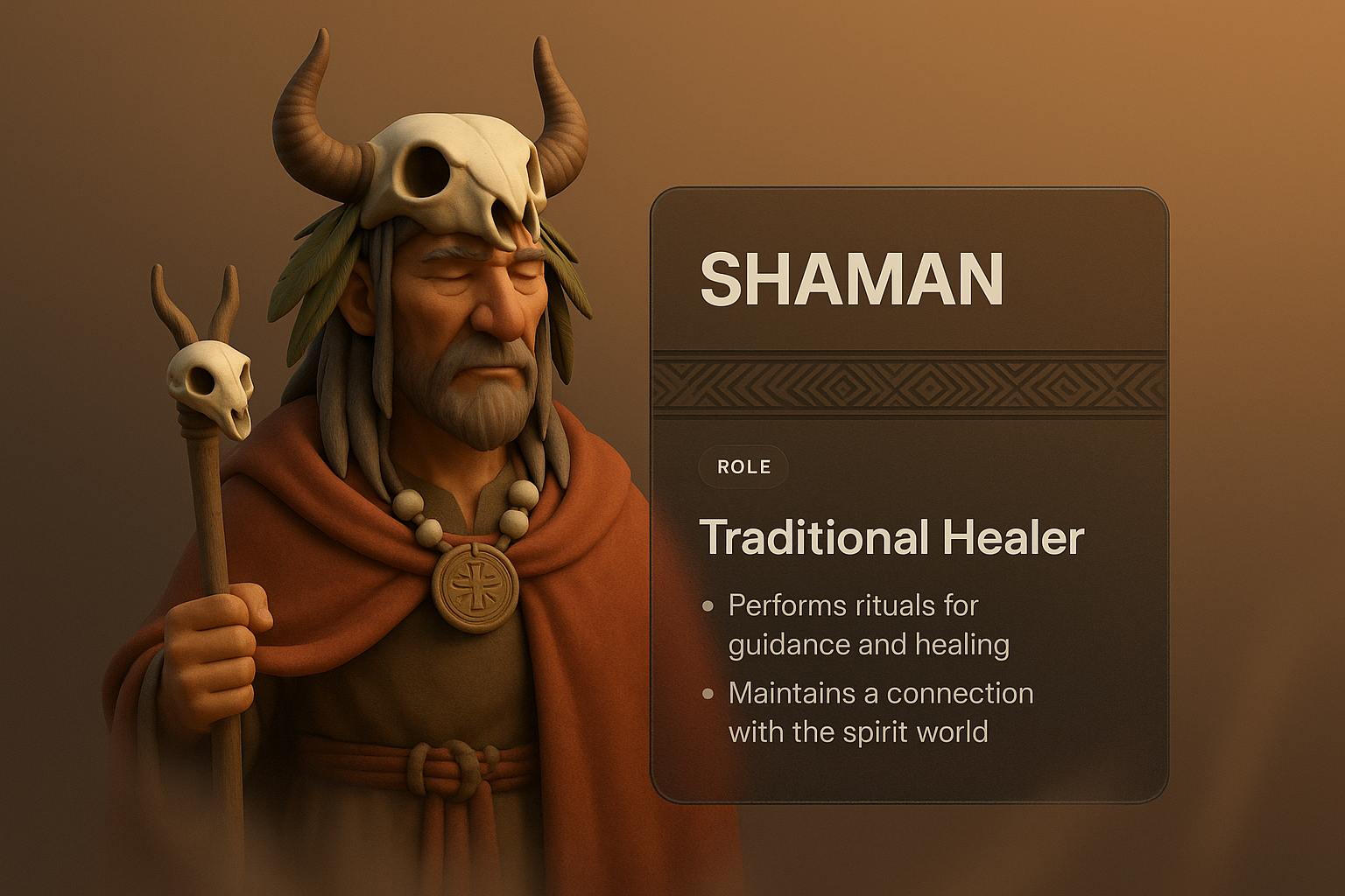 A 3D illustration of a shaman, featuring a gradient background and integrated text blocks. The design includes a dark panel with details about the shaman's role and mystical elements.