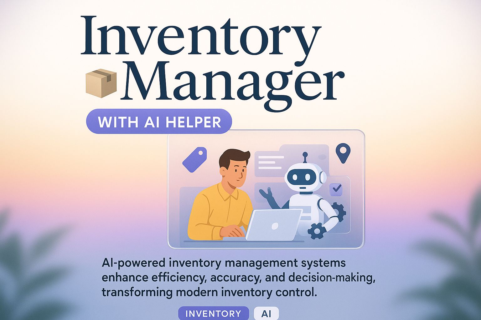 /Collection: /by davooda/Type: PNG/An engaging design featuring an inventory manager with an AI helper. The background transitions from white to a vibrant color, highlighting the main visual elements.
