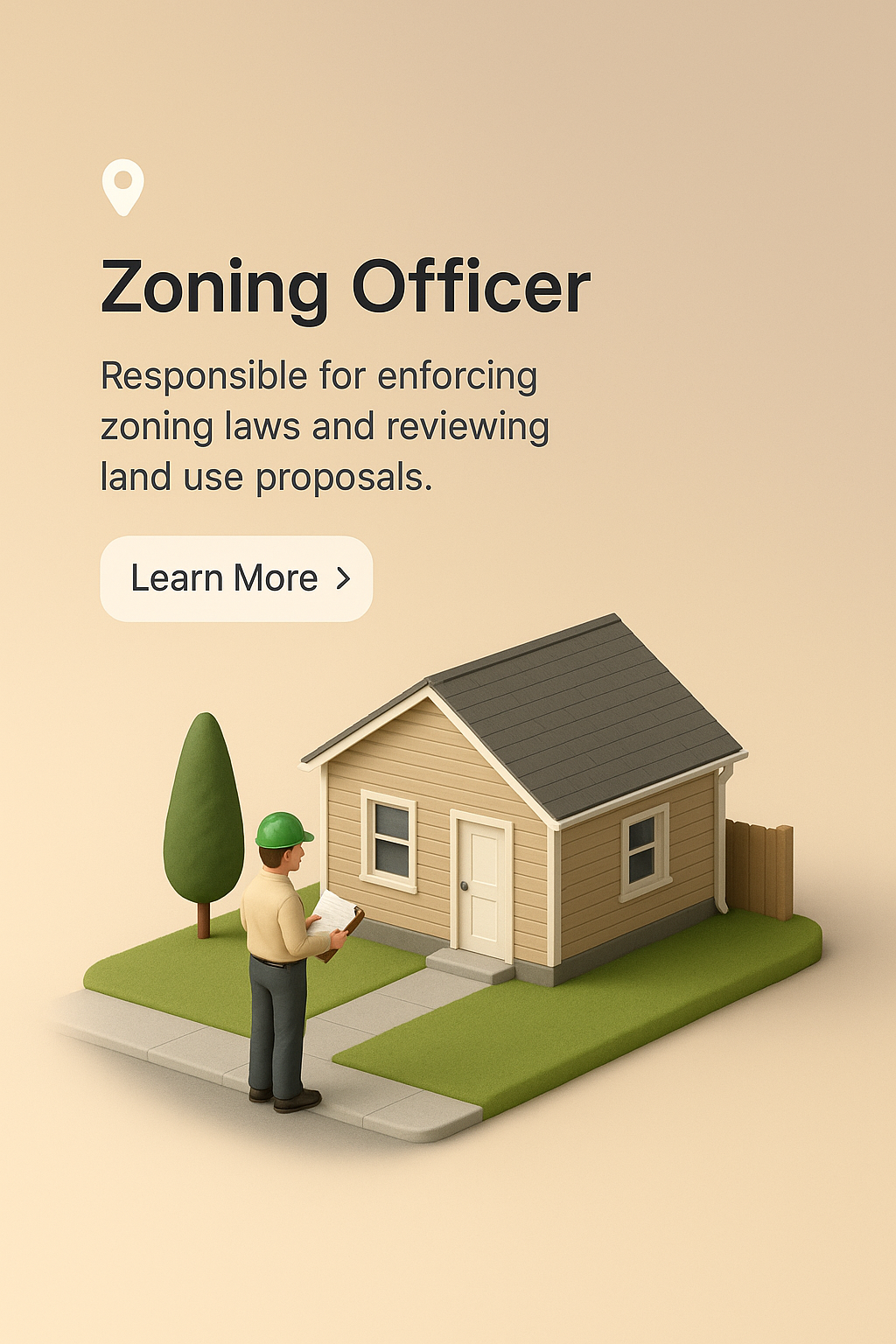 /Collection: /by davooda/Type: PNG/A zoomed-out 3D illustration of a zoning officer near a small house, showcasing the surrounding area. The scene includes a gradient background and a clear action button.