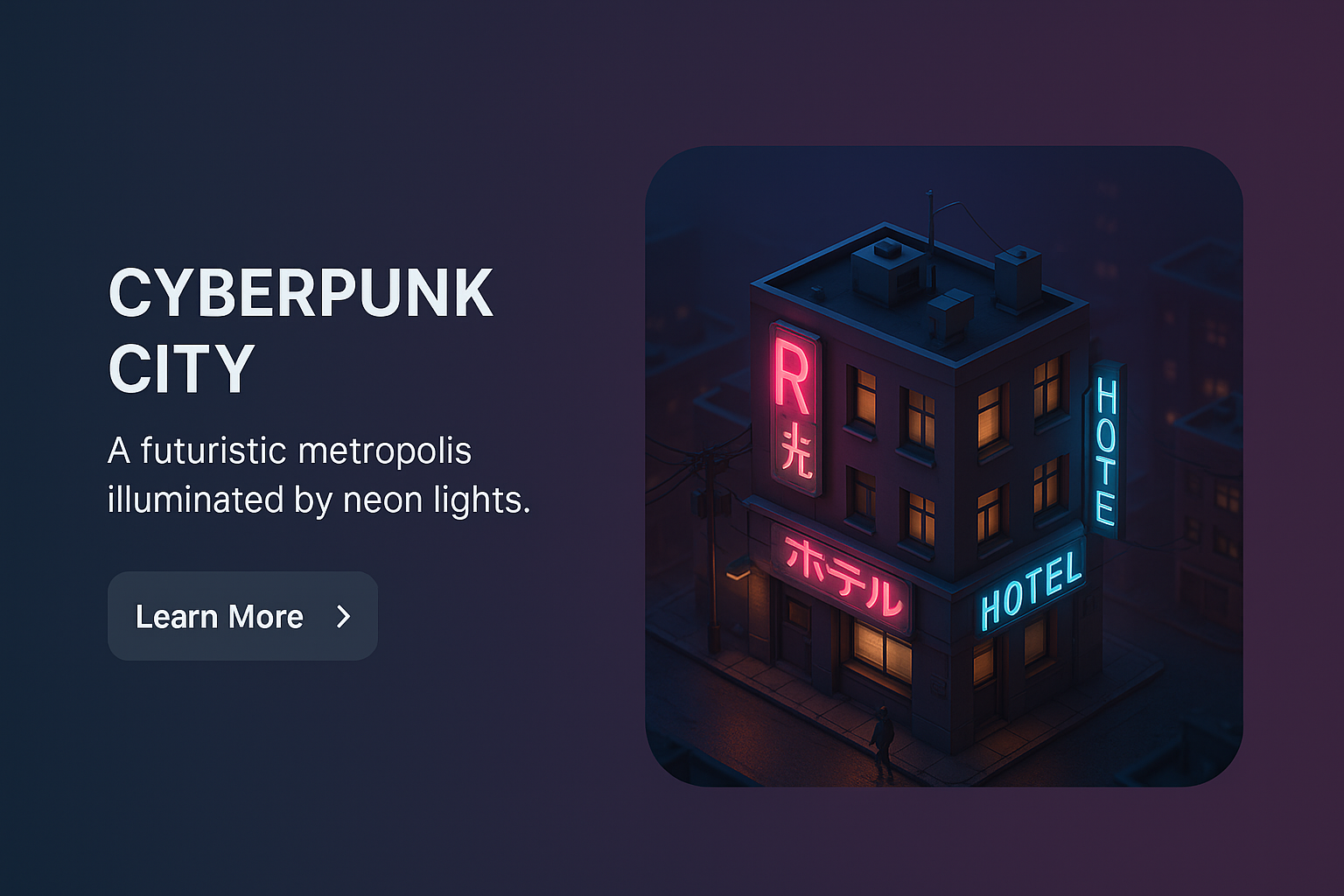 A vibrant cyberpunk city scene at night featuring a futuristic building illuminated by neon lights. The design captures a distant perspective, showcasing a detailed yet simplified 3D environment.