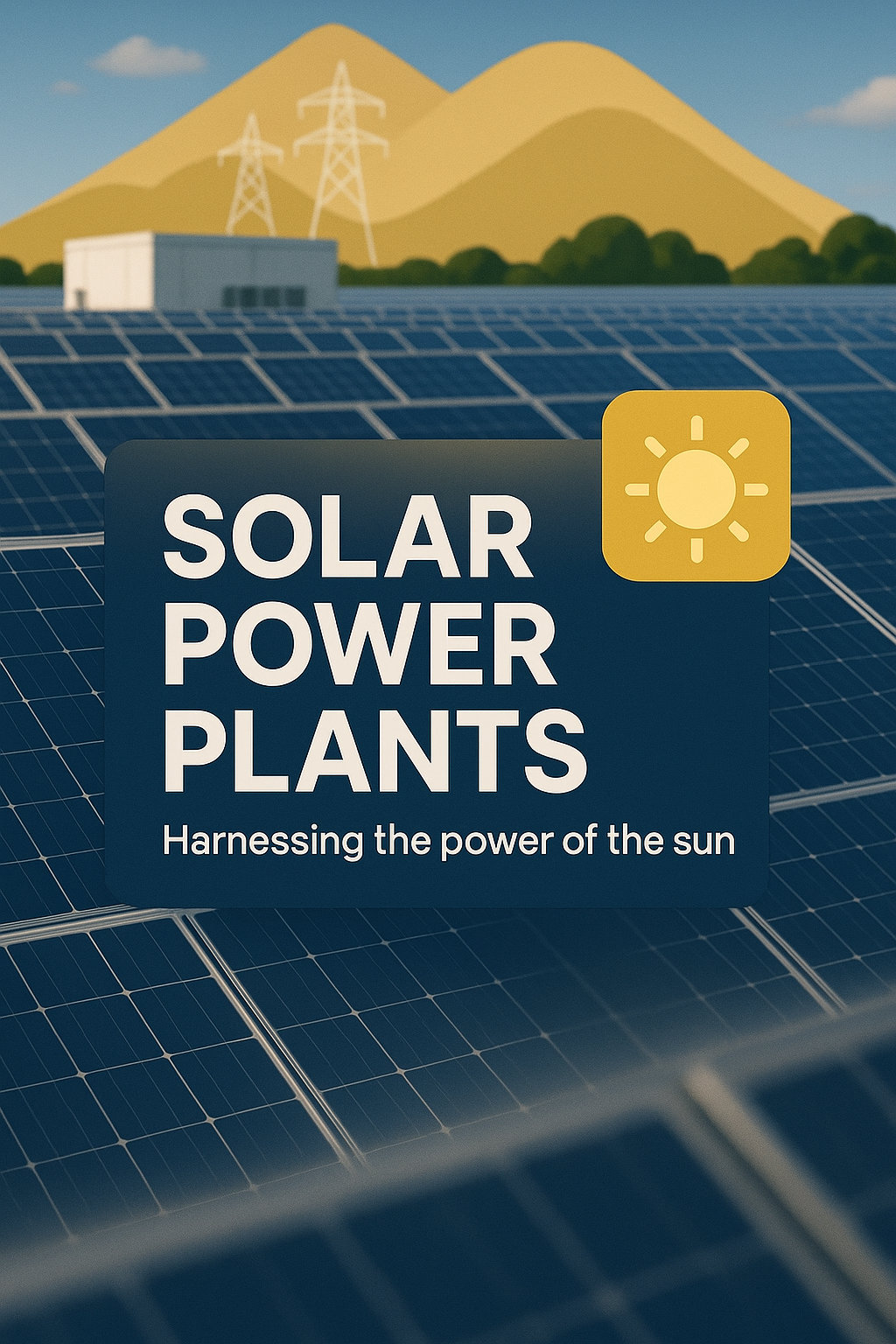A visually engaging graphic depicting solar power plants with solar panels and a sunny backdrop, ideal for educational content on renewable energy.