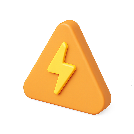 A modern 3D icon depicting a triangular warning sign with a lightning bolt, featuring bright orange and yellow colors. Ideal for use in digital applications, safety alerts, and tech-related content.