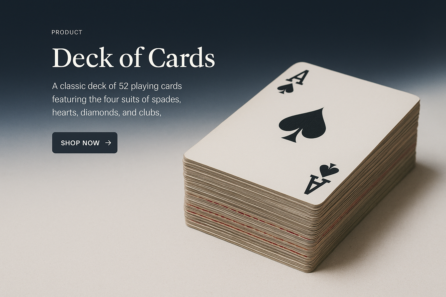 A beautifully styled image of a deck of cards showcasing the Ace of Spades atop a stack, with a gradient background transitioning from dark to white.