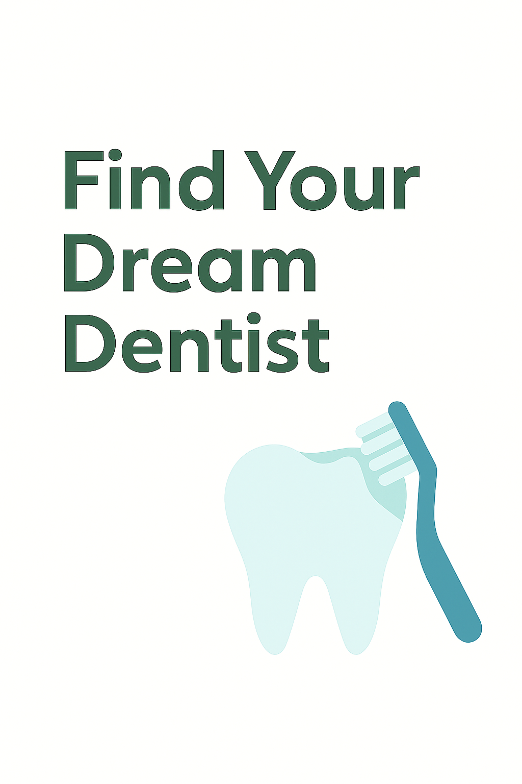A clean and modern promotional graphic encouraging users to find their ideal dentist, featuring a stylized tooth and toothbrush illustration.