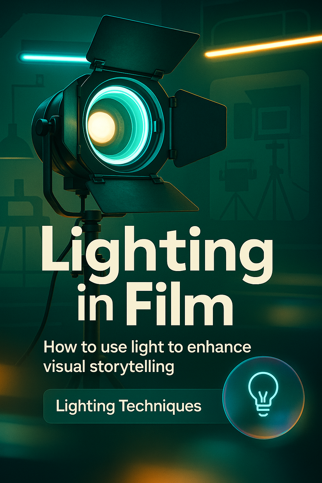 /Collection: /by davooda/Type: PNG/Informative graphic focusing on lighting techniques in film, featuring a spotlight and modern design elements, ideal for educational content in film studies.