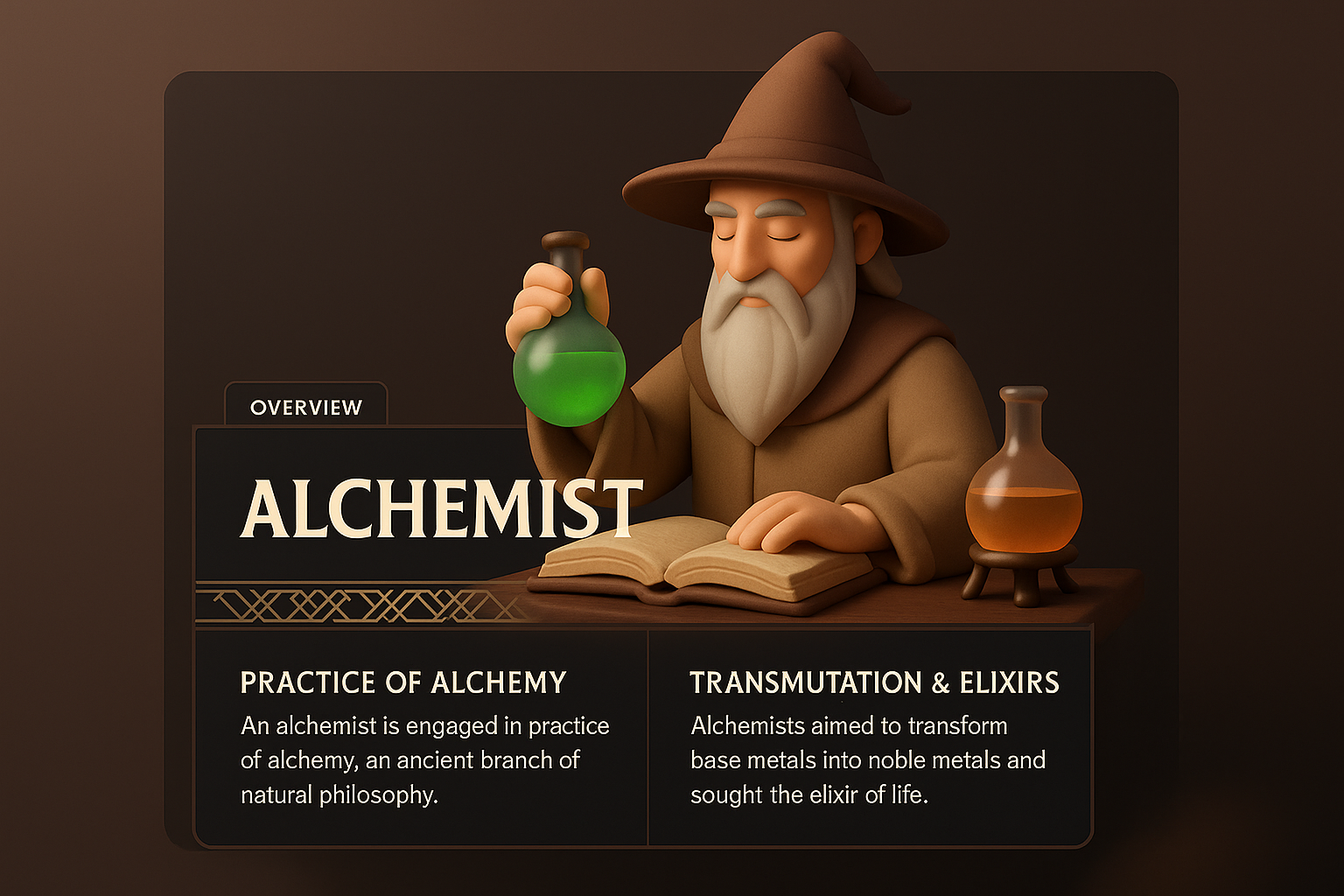 /Collection: /by davooda/Type: PNG/A 3D representation of an alchemist with a potion and book, featuring a dark design and integrated information blocks. The background smoothly transitions in color, enhancing the theme of alchemy.