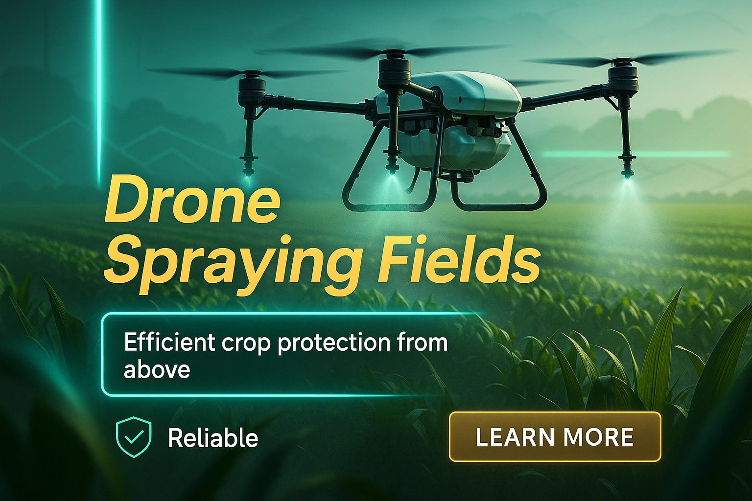 A visually appealing promotional banner showcasing a drone spraying fields, emphasizing efficiency in crop protection. Ideal for agri-tech marketing.