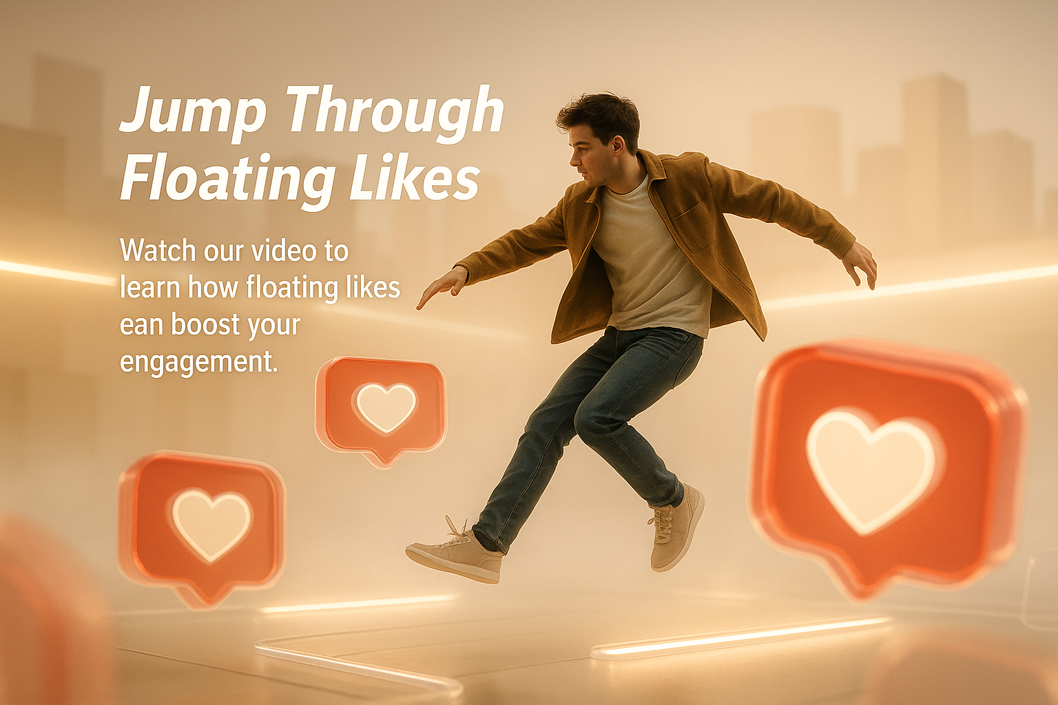 A visually engaging graphic depicting a man jumping through floating like icons, symbolizing social media engagement. Ideal for digital marketing content.