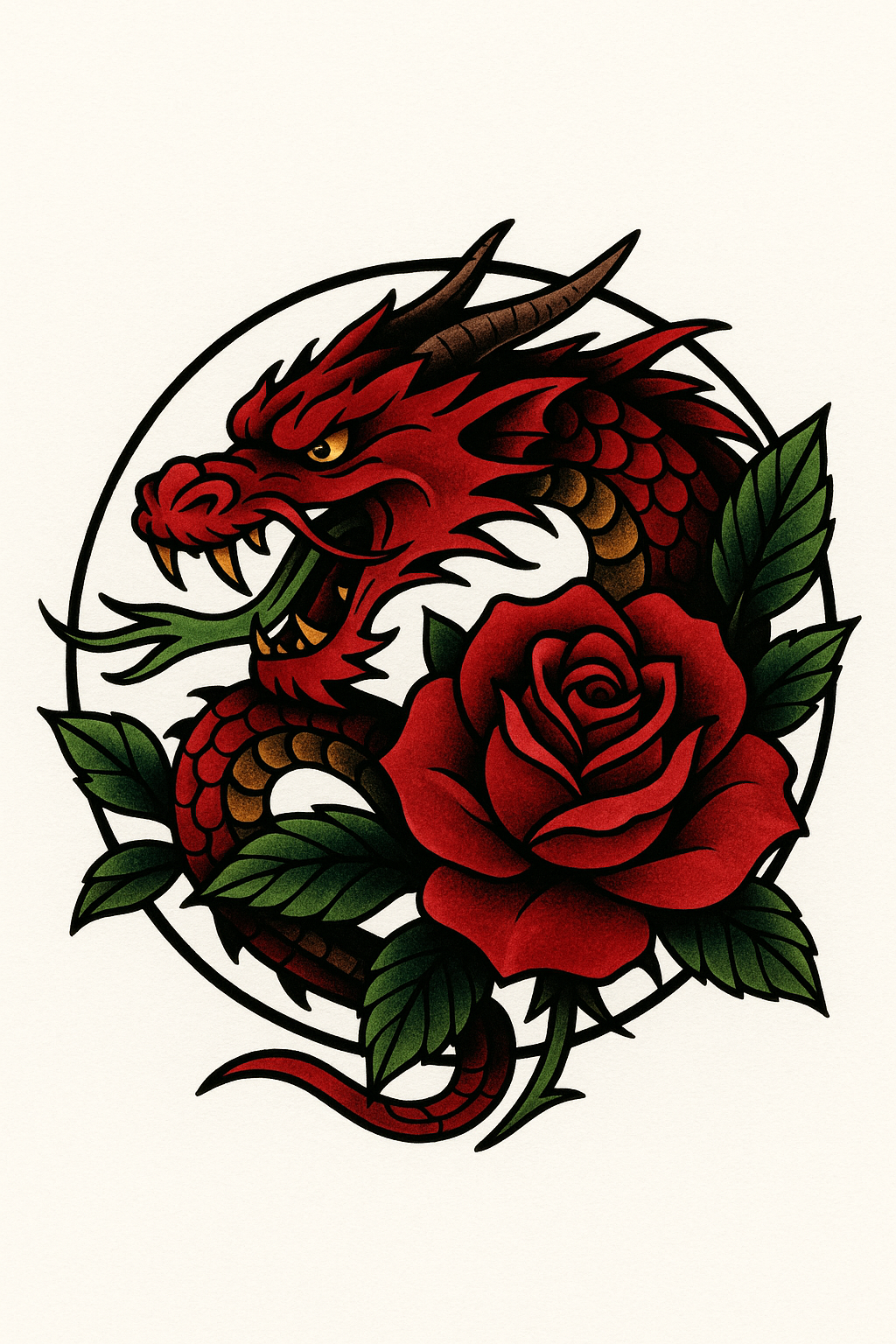 A striking tattoo design featuring a fierce red dragon entwined with a blossoming rose. The bold colors and intricate details make it ideal for tattoo enthusiasts and artists.