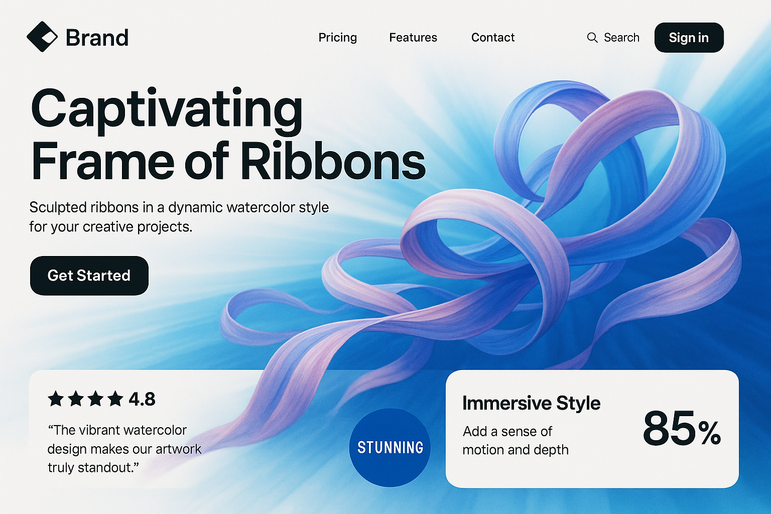 /Collection: /by davooda/Type: PNG/A visually engaging landing page featuring sculpted watercolor ribbons. It includes a captivating title, rating, action button, and a colorful gradient background for depth.