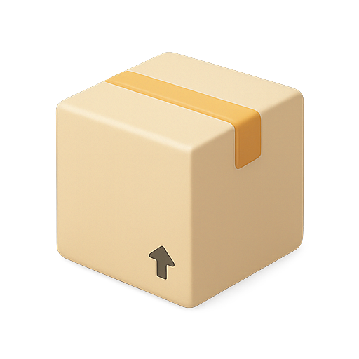 Stylized 3D icon representing a cardboard package with a tape detail and an upward arrow, suitable for e-commerce or shipping applications.