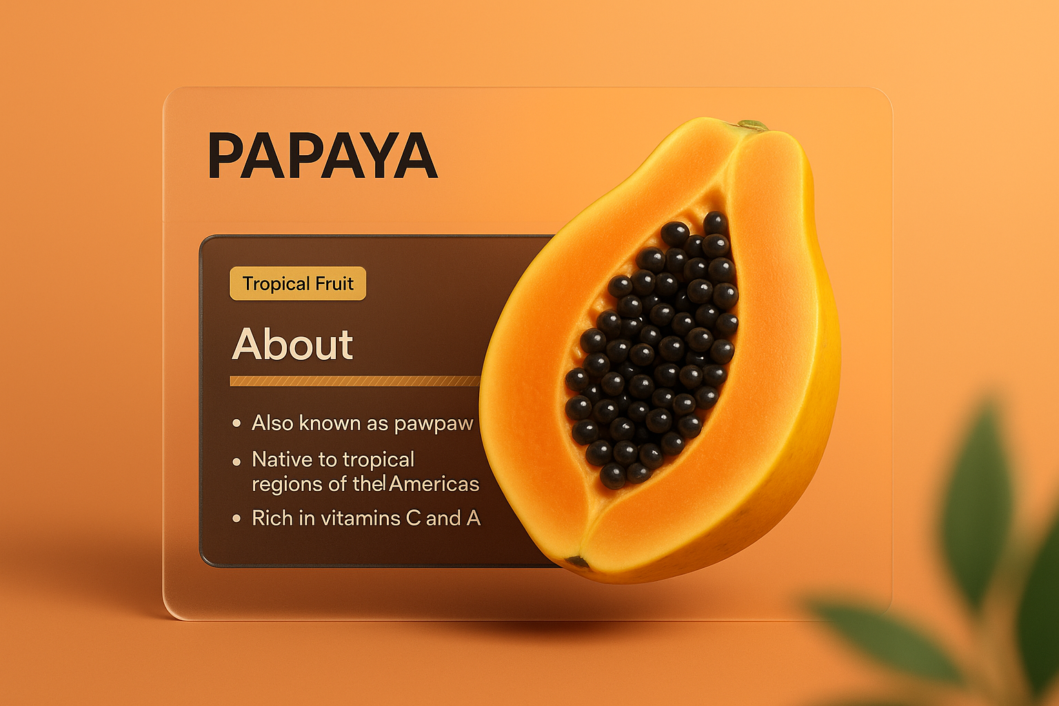 A vibrant 3D papaya is featured against a warm gradient background, with a sleek, dark overlay providing information about the fruit. The design combines realism with a modern aesthetic.