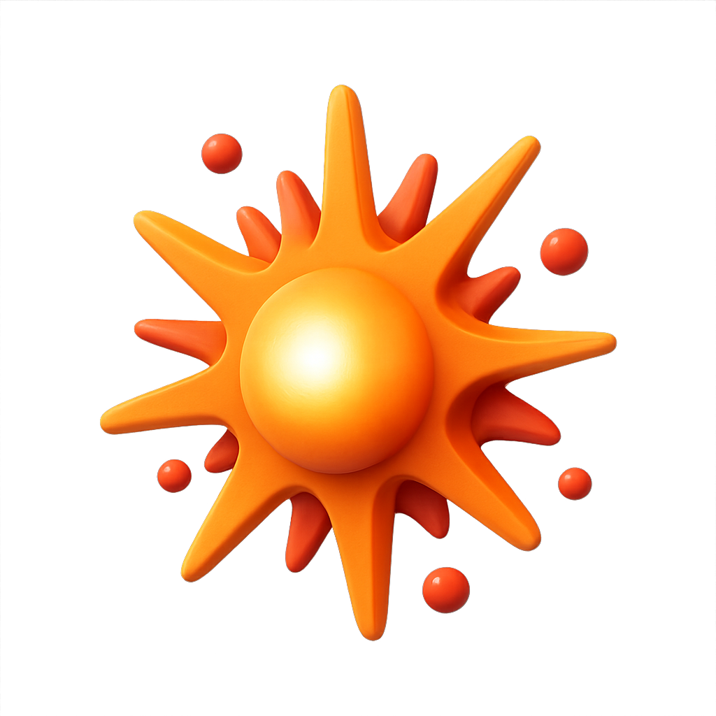 A vibrant 3D illustration of a sun icon featuring sharp rays and a central sphere, perfect for use in graphics, logos, or educational materials.