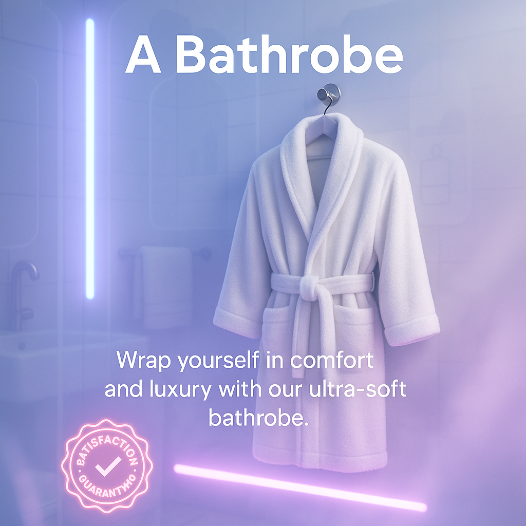 Stylish promotional image featuring a soft bathrobe in a modern bathroom setting, illuminated by vibrant neon lights, ideal for e-commerce and lifestyle marketing.
