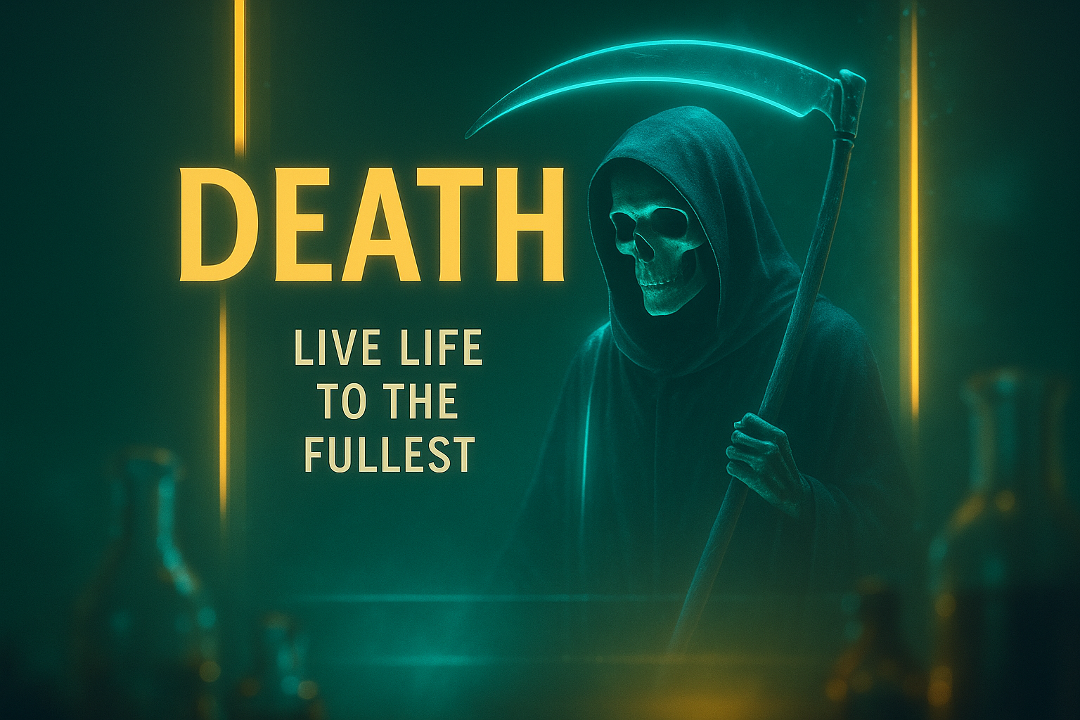 /Collection: /by davooda/Type: PNG/A striking image featuring a skeletal figure representing death in a neon-lit environment. The background is layered with deep greens and warm golds, and the text encourages living life to the fullest.