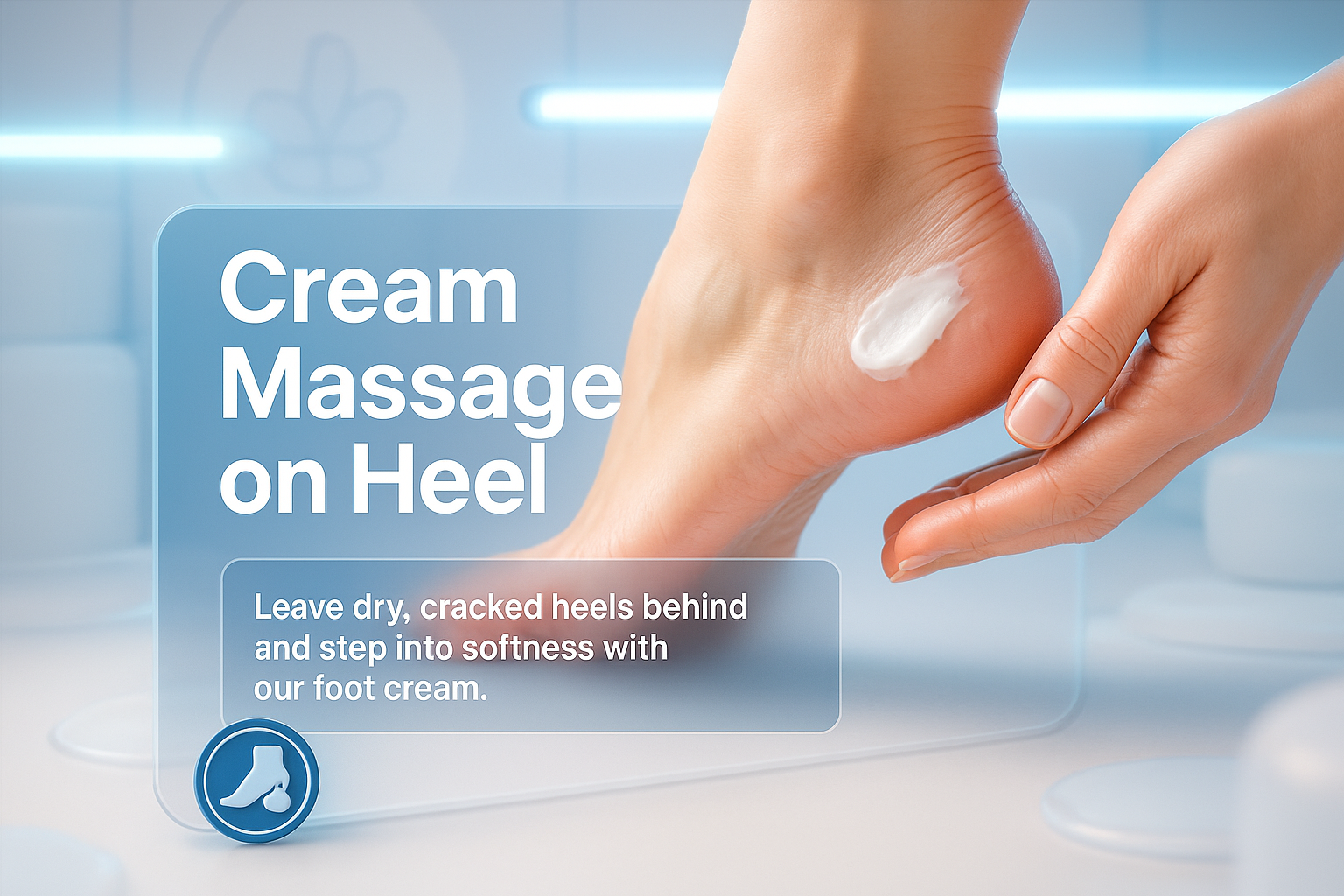 /Collection: /by davooda/Type: PNG/Engaging promotional image for a foot cream highlighting its massage feature, designed with a modern aesthetic and soothing color palette, ideal for skincare marketing.