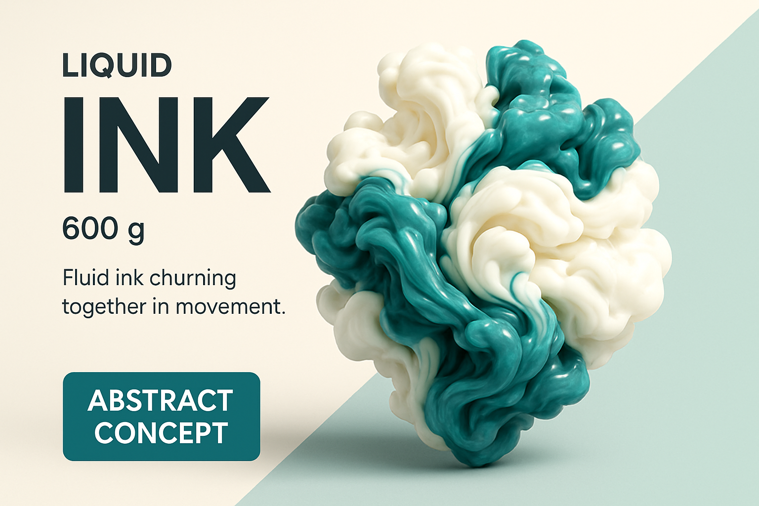 A stunning digital 3D illustration showcasing teal and white liquid ink swirling together, creating a realistic texture. The image features bold typography and a clean modern aesthetic.
