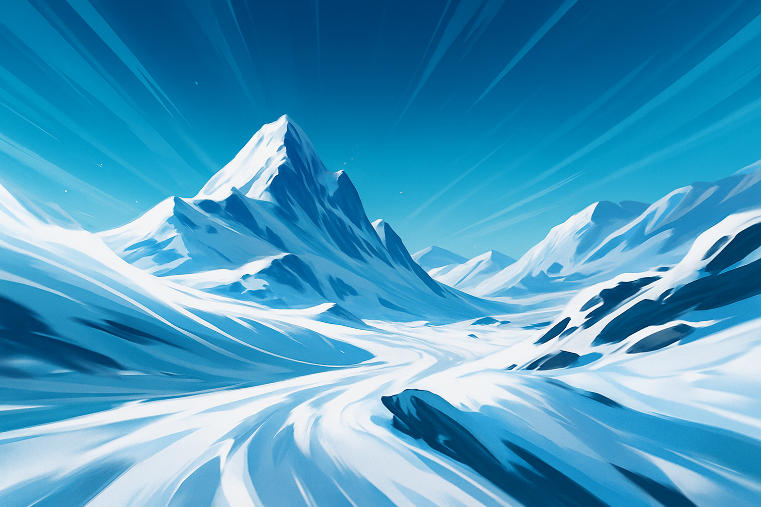 A striking winter landscape featuring towering snow-capped mountains and a winding snowy path. The dynamic composition emphasizes movement and depth, with a vibrant blue sky.
