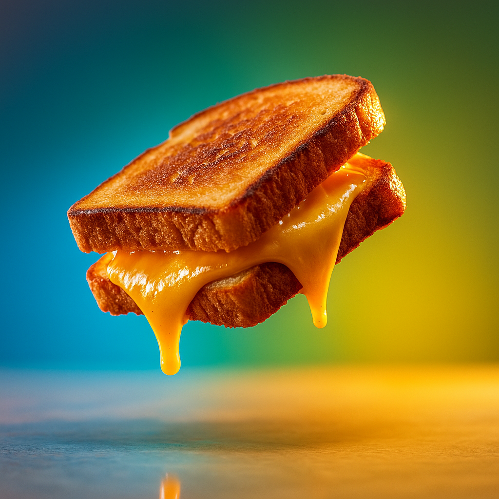 /Collection: /by davooda/Type: PNG/A beautifully captured grilled cheese sandwich, hovering mid-air with melted cheese oozing out, set against a vibrant gradient background that smoothly transitions from blue to yellow.